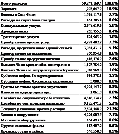 Как видно из таблицы (Таблица 7) наибольшая доля расходов приходится на текущие прочие расходы и на заработную плату вместе с взносами в социальный фонд. Около 12% направляется на социальное обеспечение и социальную помощь населению.