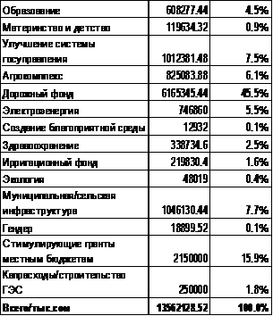 На бюджет развития по проекту 2010 г. планируется направить около 13,5 млрд. сомов. Секторальная разбивка представлена в таблице (Таблица 8). Как видно из таблицы, около 45 % средств бюджета развития направлены на улучшения дорожной инфраструктуры, включая: