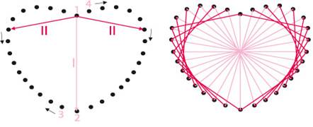Для усиления декоративного эффекта окружность или замкнутый контур можно прошить в несколько этапов, выбирая каждый раз хорду (стежок) разной длины. На схеме этапы прошивания обозначаются римскими цифрами.