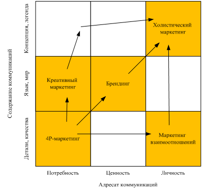Коммуникационный спектр маркетинга показывает, каким образом компании пришли к пониманию необходимости концепции нового маркетинга, который охватил бы деятельность всей компании, но основываясь на потребностях каждого отдельного клиента. Задача маркетинга — развитие контекста предложения продукции, услуг и опыта, соответствующих требованиям клиента. Чтобы изучить, создать и доставить товар или услугу отдельному потребителю в очень динамичной конкурентной среде, маркетингу необходимо инвестировать в неосязаемый капитал компании, охватывающий всех участников — потребителей, партнеров, сотрудников и сообщества. Изначально главной задачей классического маркетинга (4Р-маркетинга) было увеличить продаж уже имеющихся товаров и услуг, но за время эволюции маркетинга компании осознали необходимость перехода от концепции управления взаимоотношениями с потребителями, брендинга и креативного маркетинга к концепции управления целостностью взаимоотношений. Особенностью холистического маркетинга является создание целостной концепции компании, ориентированной на индивидуальные потребности клиента.