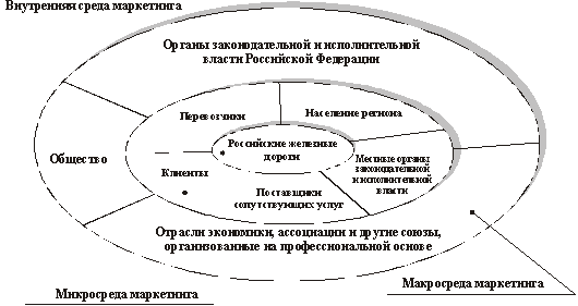 Организации макросреды маркетинга: Министерство Российской Федерации по антимонопольной политике и поддержке предпринимательства, Министерство транспорта Российской Федерации, Министерство экономического развития и торговли Российской Федерации, Национальная ассоциация транспортников (НАТР), Ассоциация пользователей услуг транспорта (ГРАССО), Координационный совет по логистике, Государственный таможенный комитет РФ (ГТК России), Российская ассоциация международных экспедиторов (РАМЭ), Международная федерация экспедиторских ассоциаций (ФИАТА), Международная ассоциация по мультимодальному транспорту (ИМТА), Ассоциация международных перевозок (АСМАП) и другие.