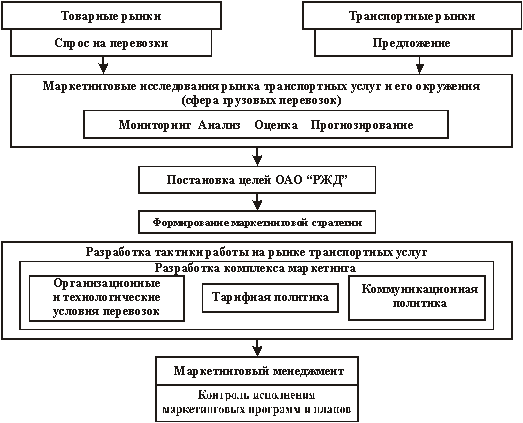 Под управлением маркетингом грузовых перевозок понимается комплекс мер, действий, решений, обеспечивающих эффективную реализацию продукции железнодорожного транспорта, повышение рентабельности отрасли при оптимизации грузопотоков и уровня транспортной составляющей в структуре валового национального продукта.