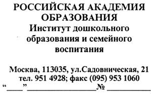 Институт дошкольного образования и семейного воспитания Российской Академии образования просит открыть экспериментальную площадку на базе государственного образовательного учреждения «Детский сад № 000» С. Москвы сроком на четыре года с сентября 2001 года по июнь 2005 года.