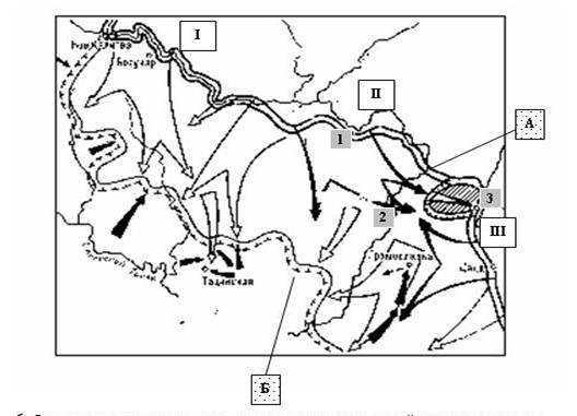 Ответ: Контрнаступление Красной Армии под Сталинградом. I - Юго-Западный фронт. II – Донской фронт. III – Сталинградский фронт. 1 – Клетская. 2 – Калач-на-Дону. 3 – Сталинград. А – к 19 ноября 1942 г. Б – к 31 декабря 1942 г.