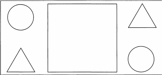 Объясни, где расположены треугольники и круги. Нарисуй любую фигуру в квадрате и объясни, где она находится.