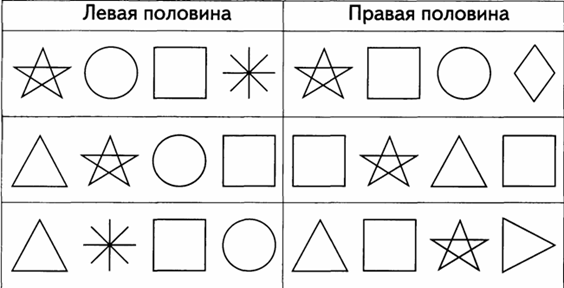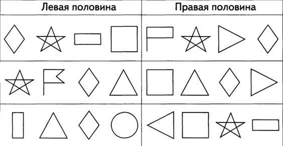 Срисуй фигуры, заштрихуй правые части этих фигур.