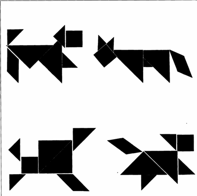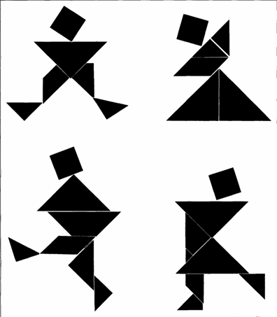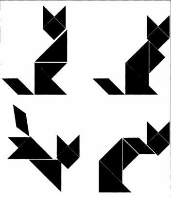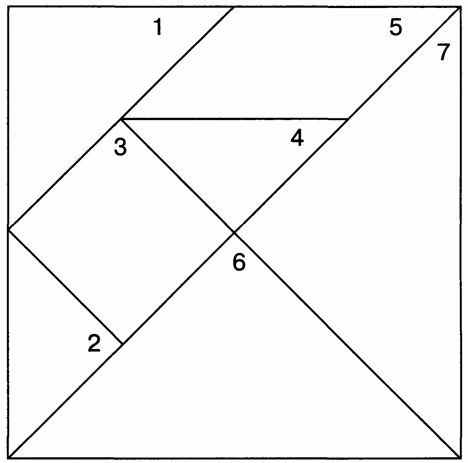 Можно сделать такой квадрат из цветной бумаги, наклеить его на плотный картон и разрезать по линиям на 7 частей. Из этих частей можно сложить разные фигурки — и простые, и самые сложные.