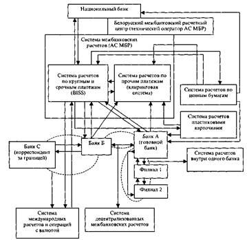 Организация межбанковских расчетов — основное назначение платежной системы. Существует два варианта совершения платежей: централизованный, через корреспондентские счета в центральном (для Беларуси — Национальном) банке, и децентрализованный, через систему взаимных корреспондентских счетов, открываемых банками друг другу, в том числе и в банках за границей. Централизованный порядок совершения платежей преобладает и реализуется на базе автоматизированной системы межбанковских расчетов (АС МБР).