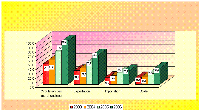 Le chiffre d’affaires du commerce extérieur de la Russie conformément au Ministère du développement économique au I-er trimestre de 2006 a fait 98.4 milliards de dollars et s’est agrandi en comparaison du I-er trimestre de 2005 de 29,8%, y compris: avec les pays de l’étranger lointain – 84 milliards de dollars (l’augmentation de 30,5%), avec les pays de la CEI – 14.4 milliards de dollars (l’augmentation de 25,8%).