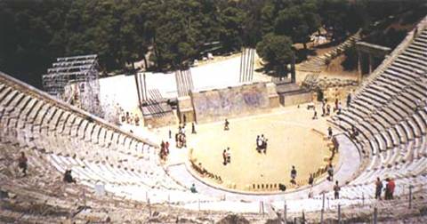 Один из известных театров, сохранившихся до наших дней - театр в Эпидавре (350-330 гг. до н. э., архитектор Поликлет Младший). Каменные ступени - театрон - врезаны в склон холма. Они частично охватывают орхестру - круглую площадку, на которой выступал хор. Орхестру замыкает скена – первоначально палатка, в которой переодевались актеры, а потом - двухъярусное каменное сооружение. Вдоль нее шло возвышение - проскений, на котором и играли актеры. Театр несколько отличался от театра греческой архаики, например, замкнутостью круга орхестры. Мимы, пантомимы способствовали развитию реалистичности и жизненности в греческом театре, но они не имели уже никакой связи с культом Диониса.
