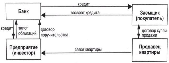 Существовал еще один способ привлечения банками кредитных ресурсов, хотя и не очень распространенный, - продажа кредитных обязательств. В основу данной схемы был положен принцип сотрудничества банка и предприятия по обеспечению работников последнего жильем (рис. 1.9.).