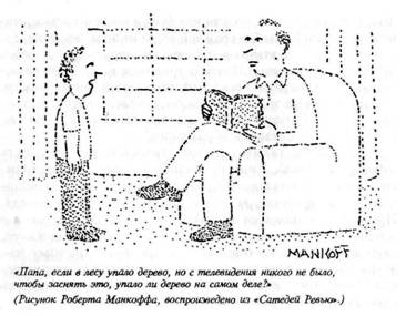 «Папа, если в лесу упало дерево, но с телевидения никого не было, чтобы заснять это, упало ли дерево на самом деле?» Эта карикатура в Сатедей ревью — отец читает книгу, сидя в кресле, а сын отвлекает его своими вопросами — показывает, что коммуникационные исследования и со-