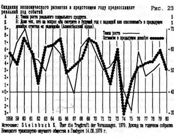 Свою интерпретацию: «Голос народа — голос судьбы» — предложил Карл Штейнбух, сопоставив по итогам года результаты проводимого Алленсбахом опроса: «Вы встречаете будущий год с надеждами или опасениями?» — с экономическим индексом следующего года — развитием валового национального продукта. Не рост или снижение надежд в конце года коррелирует с подъемом или спадом в экономике, а рост или снижение надежд до начала года коррелирует с последующим экономическим развитием (см. рис. 23).