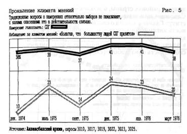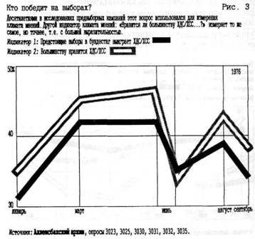 В год следующих выборов — 1976 г. — мы подвергли систематическому сравнительному анализу вопросы, с помощью которых в течение гг. измерялось восприятие распространенности мнений: «Кто победит на выборах?» «Как думает большинство людей?» Оба инструмента показывали одно и то же. Однако вопрос: «Нравится ли большинству людей ХДС/ХСС... или Вы так не думаете?» — оказался более чувствительным и тем самым более удачным инструментом: он четче показывал взлеты и падения в оценках силы партий (см. рис. 3).