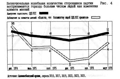 ключалась в следующем: каким образом население могло воспринимать эти в общем слабые колебания в намерениях избирателей? Мы продолжили исследования. Замеры по стране в целом уточнялись наблюдениями в опреде-
