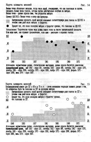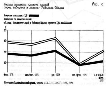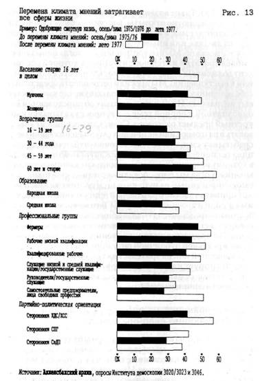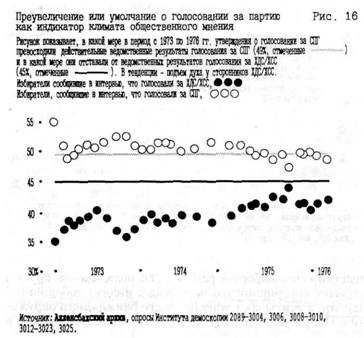 После выборов в бундестаг в 1972 г. оказалось, что один вопрос, как вспышка, высветил неравенство противостоящих лагерей — практически равных по числу своих членов и сторонников — с точки зрения их силы, «подачи» себя публично. Вопрос звучал гак: «Различные партии использовали много плакатов, значков, символики для автомашин. Символику, плакаты, значки какой партии можно было, по Вашему мнению, видеть чаще всего?» 53% респондентов ответили: предвыборной символики СПГ, 9% — ХДС/ХСС. Второй вопрос перепроверял это же обстоятельство с другой стороны: «Результаты партии на выборах в значительной степени зависят от активности ее сторонников в ходе предвыборной кампании. Сторонники какой партии обнаружили, по Вашему мнению, наибольшую личную увлеченность, чрезмерную склонность к