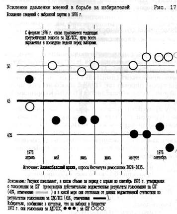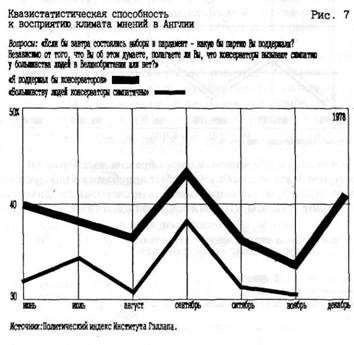 ленных районах страны, в землях — например, в Нижней Саксонии или земле Рейнланд-Пфальц (см. рис. 6). Институт Гэллапа заявил о своей готовности изучать способность английского населения воспринимать изменения в климате мнений. И хотя, кажется, намерения избирателей в Англии не столь определенны, как в ФРГ, англичане эту способность обнаружили (см. рис. 7).