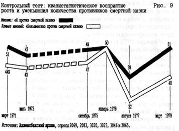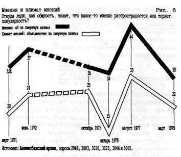 Каков предельный круг вопросов, на которые распространяется эта способность восприятия климата мнений? Следует предположить, что в поле наблюдений постоянно находилось несколько сотен тем. Начиная с марта 1971 г. мы располагаем данными об отношении населения к смертной казни и можем сравнить оценки климата мнений по этому вопросу. Нет данных за гг. — тогда у нас были другие, более важные вопросы для эмпирической проверки спирали молчания. Однако шесть измерений в гг. подтвер-