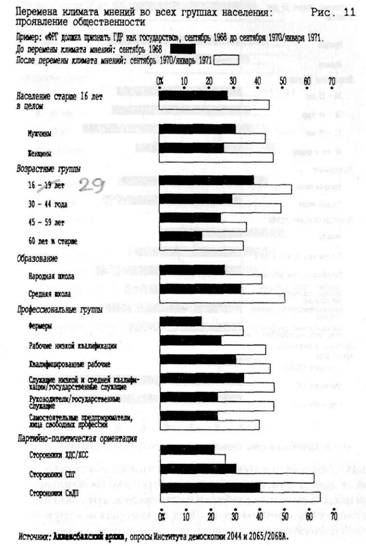 Результат напомнил мне наблюдения 1965 г. И тогда большинство респондентов на вопрос: «Как Вы думаете, кто победит на выборах?» — не возразили: «Откуда мне знать?», хотя это был бы вполне резонный ответ, если учесть демоскопичёские данные, которые месяц за месяцем отражали предвыборную гонку кандидатов на равных. Нет, ожидания проявлялись тогда все яснее и яснее, и не без последствий, как показали события в последние минуты голосования. Если перенести наблюдения 1965 г. на 1971 г., следовало ожидать спирали молчания в пользу признания ГДР.