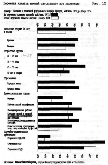 пользу СПГ, пожилые — в пользу ХДС/ХСС, рабочие — в пользу СПГ, предприниматели — в пользу ХДС. Этот факт свидетельствует не столько о тенденции быть на стороне победителя, сколько о попытке не оказаться в изоляции в своем окружении. Поскольку основные группы населения в 1972 г. в большинстве своем голосовали за СПГ, то по послевыборным опросам о голосовании перевес имели силы СПГ.