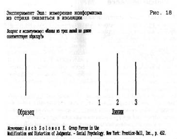 Главное достоинство лабораторного эксперимента Эша"заключается именно в том, что здесь исключены любые двусмысленности. Испытуемый своими глазами видит, что одинаковые, по оценкам большинства участников эксперимента, линии различаются по длине. Если испытуемый присоединяется к мнению большинства, вывод однозначен: дело не в надежде приобрести какой-то опыт, причина — страх перед изоляцией.