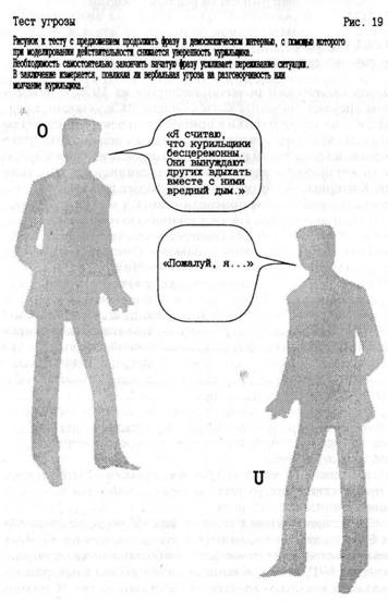 Особенно большое впечатление на курильщиков производит смоделированная двойная угроза изоляции: сначала им предлагается завершить предложение теста в беседе с радикальным противником курения в присутствии некурящих, затем тест на попутчика в купе, начинающего разговор с требования: «В присутствии некурящих следует полностью отказаться от курения». В этих условиях желание участвовать в разговоре снижается до 23%.