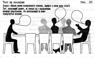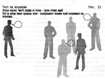Мы попытались, надеясь продвинуться на шаг вперед, эмпирически установить, не способствуют ли изоляции некоторые странности в наших взглядах. Для проверки этого обстоятельства в 1976 г. во многих алленсбахских опросах был использован тест с рисунками, наглядно изображавшими ситуацию изоляции: за столом компактно расположившейся компании людей совершенно отстра-