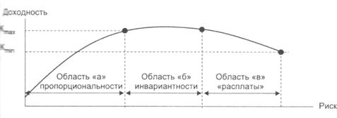 Согласно рис. 3.1. в области «а» пропорциональности стремление к наращиванию риска действительно сопровождается ростом доходности, особенно если субъект принятия решений страхуется риск определенными мерами и способен нести его издержки.