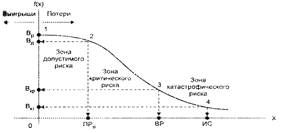 Эта кривая имеет 4 характерные точки, каждой из которых соответствует определенное значение вероятности потерь. На кривой потерь выделяют определенные области, или зоны риска, в зависимости от величины потерь.