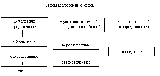 Таким образом, представляется целесообразным, что показатели риска качественно различаются в соответствии с условиями принятия рискового решения и полнотой имеющейся информации о рисковых событиях. По этому признаку показатели оценки риска могут быть классифицированы следующим образом: