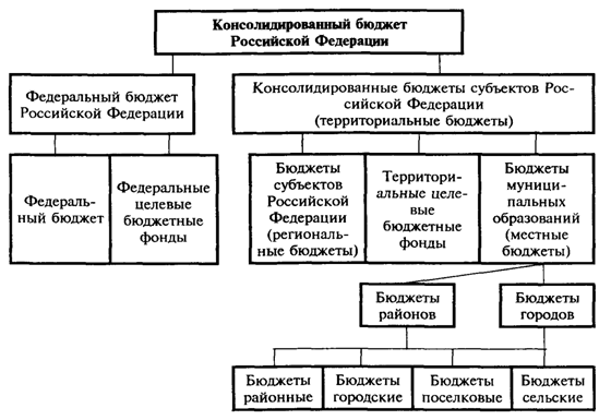 Бюджетная система Российской Федерации включает: федеральный бюджет, 21 республиканский бюджет республик в составе РФ, 55 краевых и областных бюджетов и бюджета городов Москвы и Санкт-Петербурга, один областной бюджет автономной области, 10 окружных бюджетов, автономных округов и около 29 тысяч местных бюджетов (районные, городские, поселковые и сельские бюджета). [7]