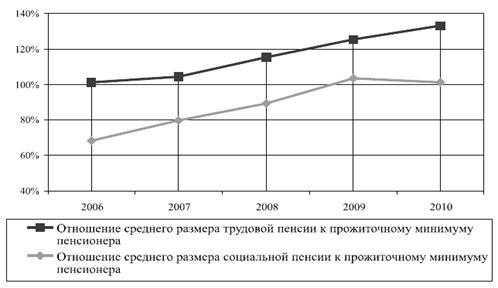 Ожидается, что средний размер трудовой пенсии за 3 года возрастет в 1,7 раза, а начиная с 2009 года размер социальной пенсии будет превышать прожиточный минимум пенсионера (рисунок 6).