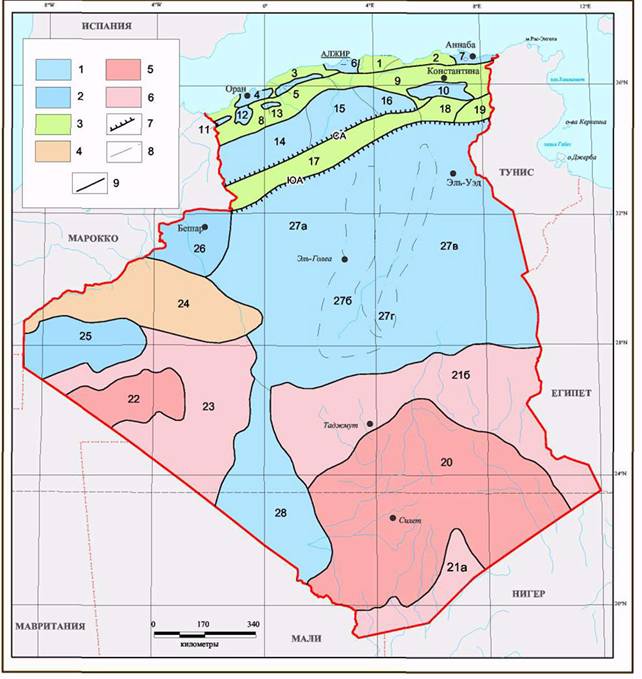 Геолого-структурные условия. Большая часть территории Алжира находится в пределах Африканской платформы. На крайнем юге страны располагаются выступы фундамента платформы – Ахаггарский массив, сложенный докембрийскими метаморфическими породами, и плато Эль-Эглаб, отделённое от Ахаггарского массива прогибом Угарты-Танезруфта. В северном направлении докембрийские породы погружаются под осадочный чехол, сложенный морскими нижне и среднепалеозойскими, лагунно-континентальными верхнепалеозойскими и нижнемеловыми, а также морскими верхнемеловыми (частично палеогеновыми) отложениями.