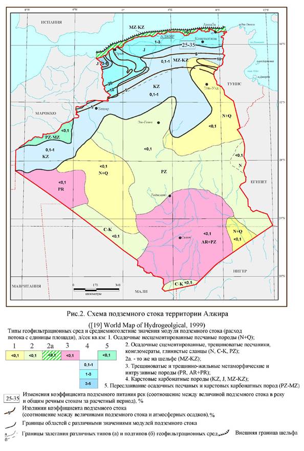 На рисунке № 2 приведена схема подземного стока по территории Алжира ([19] “World Map of Hydrogeological…”, 1999; [17] “Groundwater Resources...”, 2004). На схеме чётко выделяется территория Алжирской Сахары с модулем подземного стока < 0,1 и Алжирского Атласа, где модуль достигает 0,1-1, 1-3, 3-5 л/с км2 и более. Изолинии коэффициента подземного стока подсчитаны только по территории Алжирского Атласа, где они увеличиваются с юга на северо-запад с 5 до 10-20 % и более.