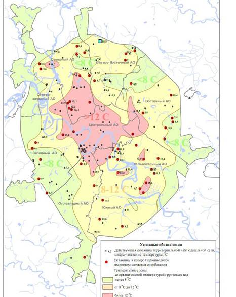 На сегодняшнем уровне развития гидрогеологического мониторинга города можно только ориентировочно определить распространение температурных зон грунтовых вод (см. рис. 1), оценить точечно изменение химического состава в зависимости от сезона года (лето-осень) в период г., а также констатировать, что гидродинамический режим грунтовых вод существенно нарушен.