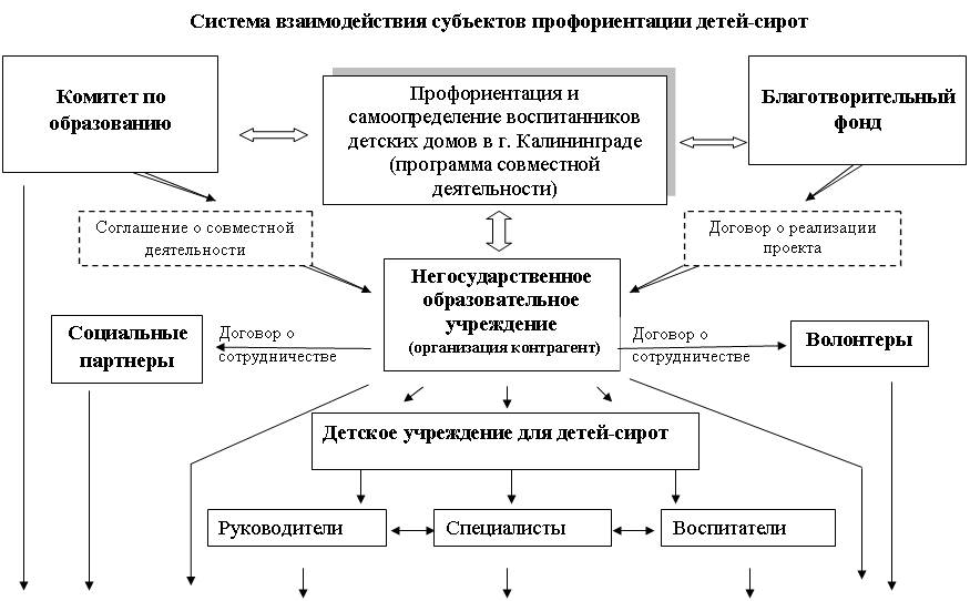 - связи и отношения субъектов профориентационной деятельности (воспитанники, детские дома, муниципалитет, благотворительный фонд, оранизация-контрагент благотворительного фонда);