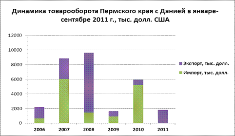 Доля экспорта в Данию в общем объеме экспорта Пермского края в 2011 г. составила 0,0,35%. При этом экспорт вырос по сравнению с аналогичным периодом предыдущего года на 1 095,2 тыс. долл., а объем импорта сократился в 1,7 раз и составил за 9 месяцев 2011 года 3 052,3 тыс. долл. США (0,51% в общем объеме импорта Пермского края).