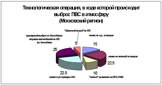 Особенность Московского региона состоит в том, что суточные суточные потери углеводородов на одной «усредненной» АЗС (не оборудованной системами предотвращения утечки или улавливания паров бензина) только от «больших» и «малых» дыханий могут составлять порядка 50-70 кг, а, соответственно, годовые – 16000 ¸25000 кг. (с учетом выбросов паров бензина из бензобаков при заправке автомобилей), а суммарно по г. Москве и Московской области, при годовом потреблении бензина около 3,8 млн. тонн составляют более 30000 т/год. Диверсификация потерь бензина от испарения по операциям перевалки светлых нефтепродуктов на НПЗ, НФБ и АЗС Московского региона выглядит следующим образом (Диаграмма 1., Таблица2).
