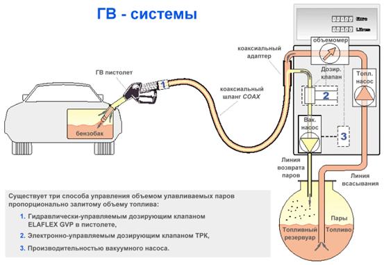 Рассмотренные выше системы УЛФ, согласно Европейской классификации, представляют собой системы реализующие “Стадию I ” паровозврата (улавливания). Для реализации “Стадии II ” некоторые АЗС принадлежащие Московской Топливной Компании, в своё время были оснащены системами паровозврата (ГВ система)из баков автомобилей. Предыстория появления таких систем такова. В конце 1980-ых компания ELAFLEX разработала активную ГВ-систему с вакуумным насосом, Эта, так называемая "открытая система", и сегодня является наиболее предпочитаемой системой в Европе и других частях мира.