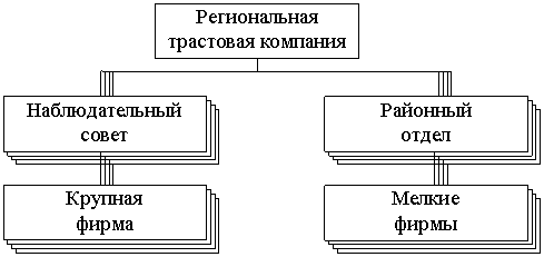 Необходимо заметить, что на конкурентных рынках капитала рыночные условия, а также финансовые и управленческие возможности трастовых компаний определяют, как долго они могут удерживать приобретенную компанию под своим контролем и какая реструктуризация будет предпринята. В условиях переходного периода региональная трастовая компания имеет другие стимулы. В частности, прибыльность не является единственным критерием, определяющим то, как доверительный собственник осуществляет контроль. Возможная схема контроля РТК за компаниями региона представлена на рис. 4.8.