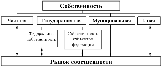 Схема оборота собственности представлена на рис. 1.8. На схеме показано взаимодействие форм собственности (ст. 212 ГК РФ): государственной (федеральная собственность и собственность субъектов Российской Федерации), муниципальной, частной и иной на рынке собственности.