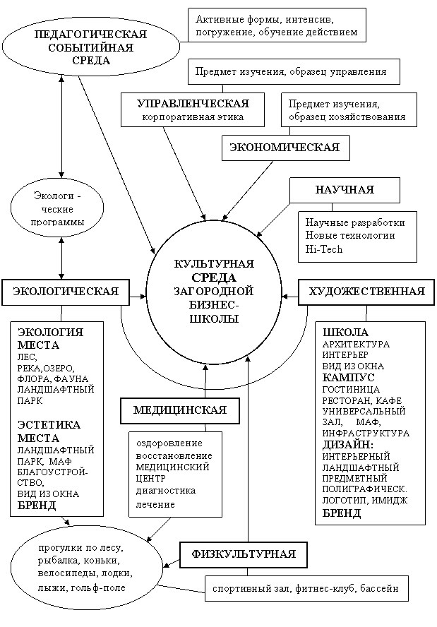 В данном исследовании разработана культурно-деятельная модель бизнес-школы как элемента интенсивного образовательного процесса взрослых, расположенного в природном окружении, с развитой инфраструктурой, способствующей комфортной жизнедеятельности слушателей, с функционирующей системой оздоровительных комплексов, мест отдыха, расслабления и восстановления, прогулок на чистом воздухе и эстетическим наслаждением. Задача подобного комплекса не только дать знания, но и, через любование и приобщение к природе, участию в экологических программах, - дать толчок к пониманию необходимости и возможности жить на природе и вместе с природой.