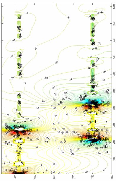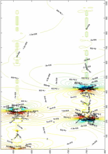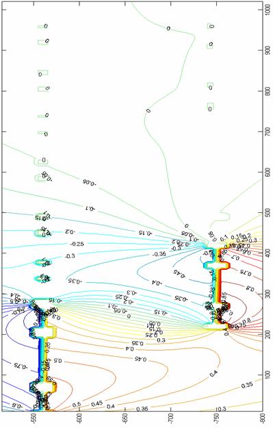 При ведении горных работ на затухающей стадии ведения горных работ на руднике возникают стандартные ситуации при которых намеченные к отработке запасы оконтуриваются значительными по размерам выработанными пространствами уже отработанных столбов. Это в наибольшей мере сказывается при обратном порядке отработки запасов рудника, когда горные работы стягиваются от границ к центру шахтного поля на всех отрабатываемых горизонтах. В некоторых случаях возникает необходимость вести горные работы одновременно на двух горизонтах в лавах, находящихся непосредственно друг под другом, что также приводит к интенсификации опорного давления в несущих элементах массива. На рис. 2-4 приведены графические интерпретации основных параметров напряженно-деформированного состояния в соляном массиве для условий разработанной геомеханической модели рис.1. Приведены зависимости для вертикальной компоненты вектора смещений, компонентов тензоров напряжений и деформаций, обладающие наибольшей информативностью. По цветовой гамме от синего к красному происходит рост исследуемого параметра. Также в работе были получены результаты для горизонтальных и касательных компонент тензоров напряжений и деформаций, горизонтальной компоненты вектора смещений. Установлено, что параметры опорного давления со стороны выработанных пространств смежноотработанного столба зависят главным образом от глубины разработки и от ширины охранного целика между ними. Наиболее неблагоприятные условия поддержания характерны для подготовительных выработок лавы 7, что характеризуется значительным уровнем растягивающих напряжений и деформаций.