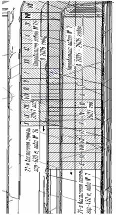 На рис.5 показан совмещенный план Второго и Третьего калийных горизонтов на участке их отработки лавами №№ 7 и 76, на основе которого была составлена геомеханическая модель (рис.1).