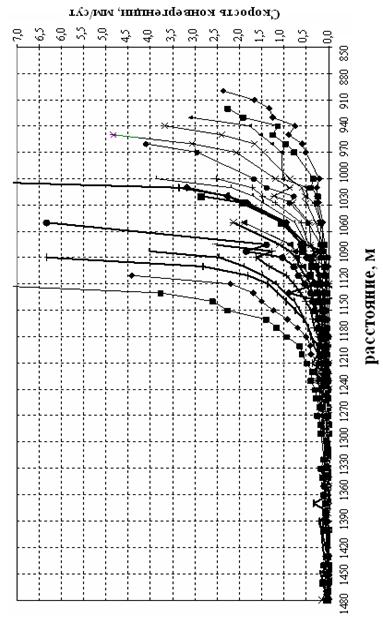 Как видно из приведенных графических зависимостей (рис.6 и 7), влияние движущегося забоя лавы на деформирование контура (смещение кровли, конвергенция стенок) подготовительных выработок в районе замерных станций в наибольшей мере сказывается на расстоянии 150-250 м. На большем расстоянии до забоя лавы такая зависимость визуально практически не отмечается.
