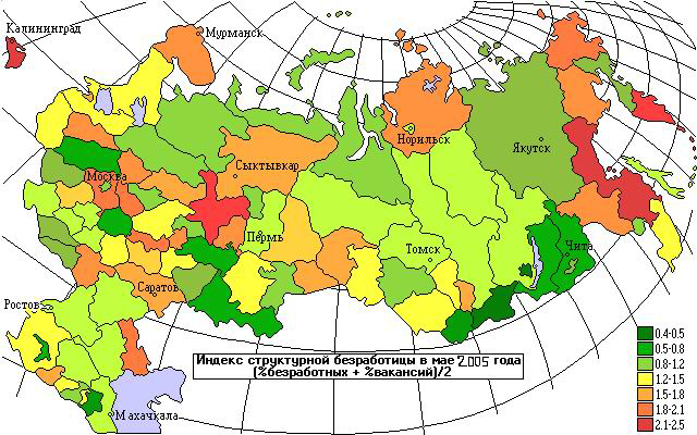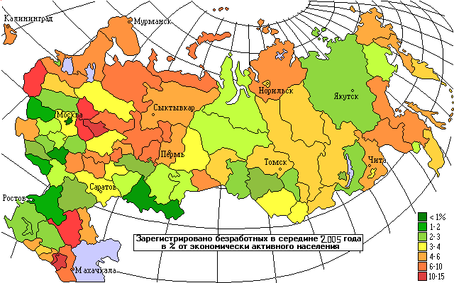 В России в начале 2001 года зарегистрированная безработица составляла 0.1% экономически активного населения. За последние 4 года процент безработицы значительно вырос и в 2005 году достиг 3.7%, что соответствует 2.6 миллионам безработных. Понятие безработицы, используемое МОТ несколько шире и учитывает также людей, не имеющих работу, но не зарегистрированных на бирже труда. В соответствии с методикой МОТ, которой придерживается Госкомстат РФ, в марте 2005 года в России было 6.2 млн. безработных (8.5% рабочей силы)/ По регионам зарегистрированная безработица распределяется неравномерно.