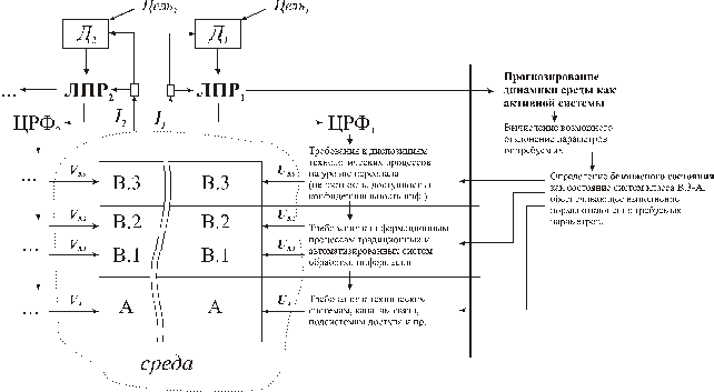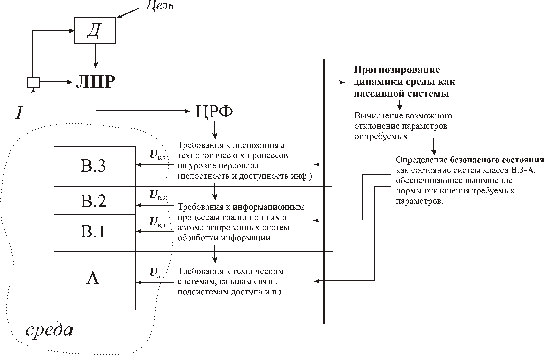 У субъекта защиты изначально есть некая цель, на основании которой с учетом параметров среды (I) формируется доктрина (Д). На основании информации об обстановке I и доктрины лицо, принимающее решение (ЛПР – субъект безопасности) формирует целевой режим функционирования системы (ЦРФ). Кроме этого ЛПР необходимо прогнозировать динамику среды как пассивной среды: пассивной, т. к. в условиях отсутствия конфликта мы исключаем из рассмотрения свободные информационные системы, которые можно рассматривать как активные элементы. Способность ЛПР найти оптимальный ЦРФ, удовлетворяющий конечной цели, а так же спрогнозировать вероятные угрозы, характеризует информационную безопасность субъекта по пункту B. На основании прогноза выявляются возможные отклонения функциональных характеристик подсистем от целевого режима функционирования и вырабатываются управляющие воздействия на каждую из подсистем (UB.3 … UA). Если такие управляющие воздействия можно осуществить, то система информационно безопасна в соответствии с пунктом A.