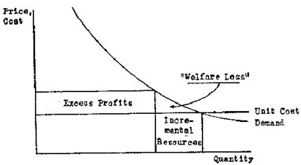 На данном рисунке, иллюстрирующем аналитическую схему А. Харбергера, сравнивается две ситуации: ситуации конкуренции, когда цена устанавливается на уровне издержек, и ситуация монополии, когда цена становится больше издержек.