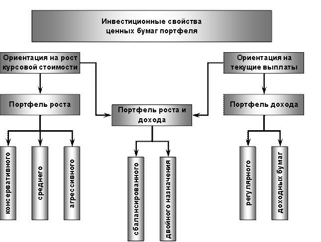В зависимости от цели формирования портфеля ценных бумаг различают портфели роста, портфели дохода и их комбинации (схема представлена в Приложении 1).
