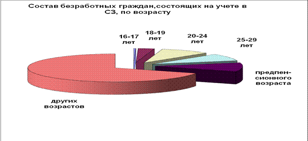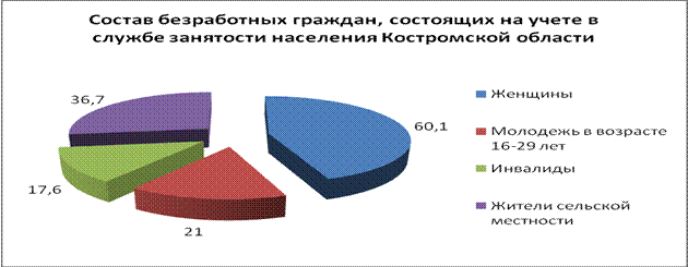 В составе безработных граждан, состоящих на учете в службе занятости населения Костромской области наибольший удельный вес 68,7% составляют граждане в возраст5 от 30 лет до предпенсионного возраста, а наименьший – 0,4%- молодежь в возрасте 16-17 лет.